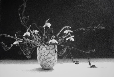 Snowdrops, and alder twigs in a Japanese tea cup. The finished drawing I began on Ash Wednesday, a day that for various reasons always has me meditating on death and renewal. It seemed more than appropriate – significant to work in pure charcoal; that simplest of materials derived from very slowly burning the small, otherwise useless pieces of wood. In that sense the drawing is, in both subject matter and physically – ‘out of the wood’.